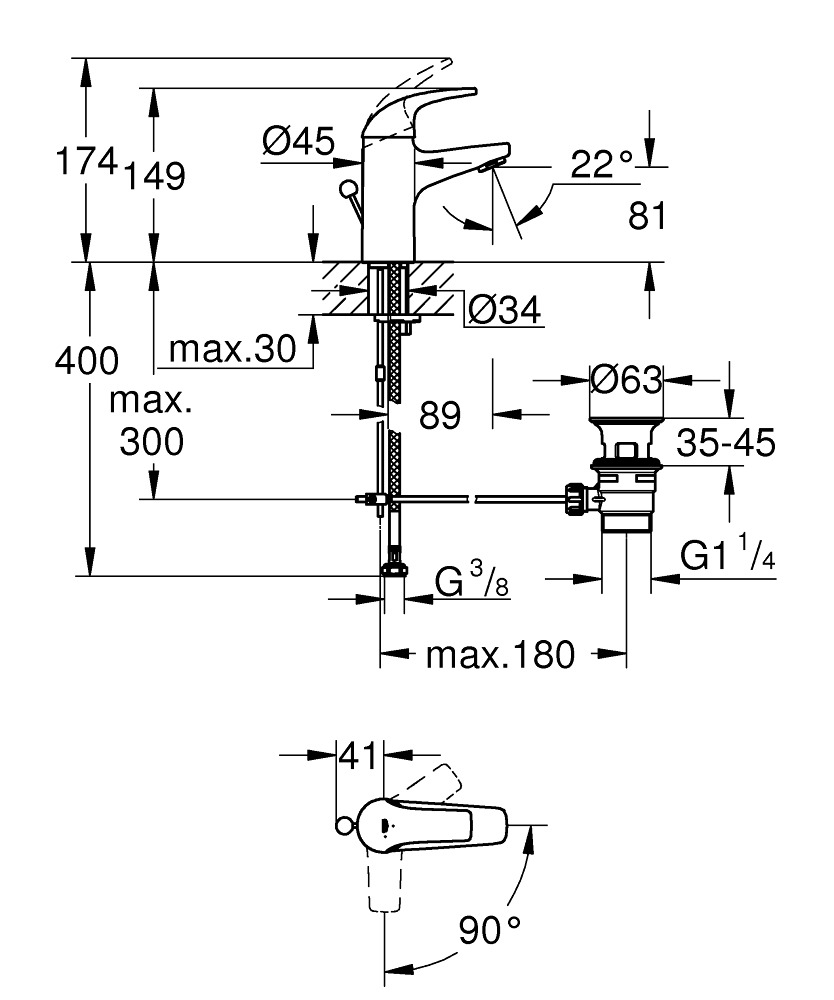 Caractéristiques du mitigeur monocommande lavabo taille S, Chrome Grohe Start Curve (23765000) :