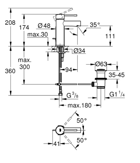 Caractéristiques du Mitigeur monocommande taille S avec tirette et vidage, cartouche en céramique, Chrome, Grohe Essence (24175001) :