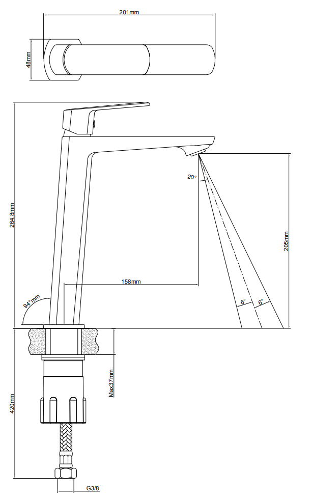 - Hauteur du mitigeur: 26,4 cm