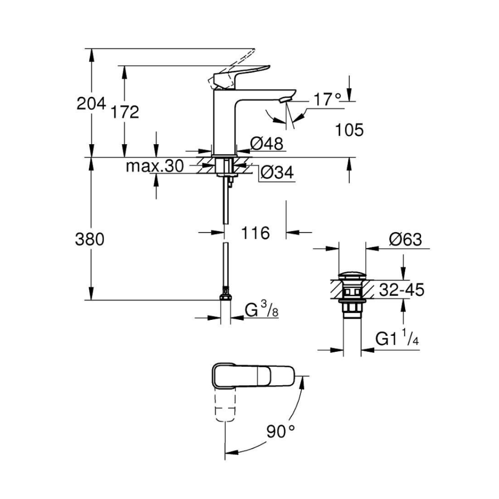 Caractéristiques du mitigeur monocommande de lavabo à levier avec vidage Clic-Clac, Grohe Dice, chrome brillant (1018360000) :