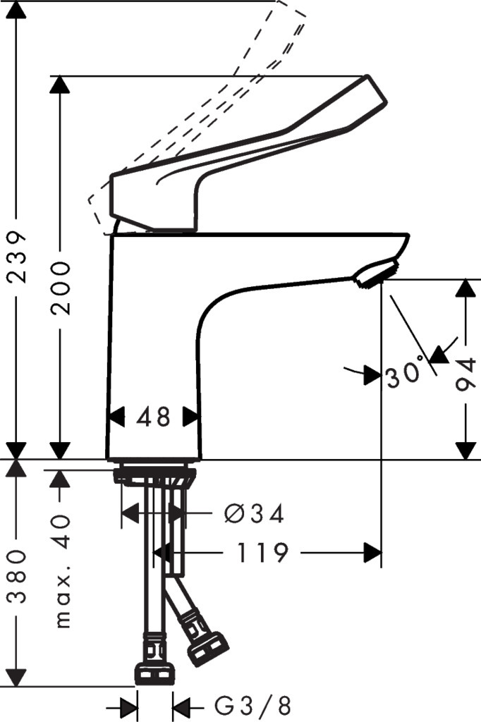 Caractéristiques du Mitigeur PMR lavabo sans tirette ni vidage avec poignée extra longue, ComfortZone 100, Chrome, Hansgrohe Focus Care (31915000) :