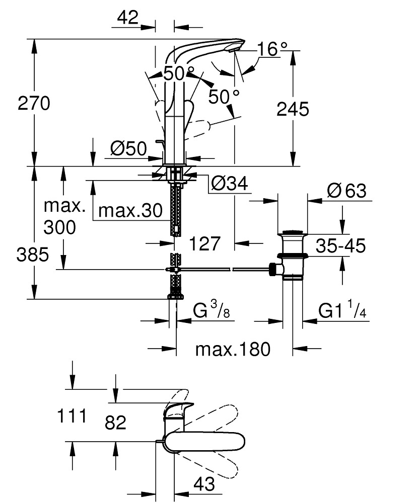 Caracteristiques du mitigeur monocommande lavabo taille L, GROHE Wave, chrome (23584001) :