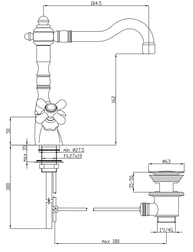 Caractéristiques du Mélangeur de lavabo XL avec tirette et bonde, Design vintage, Chrome, Paffoni Ricordi (IR085) :