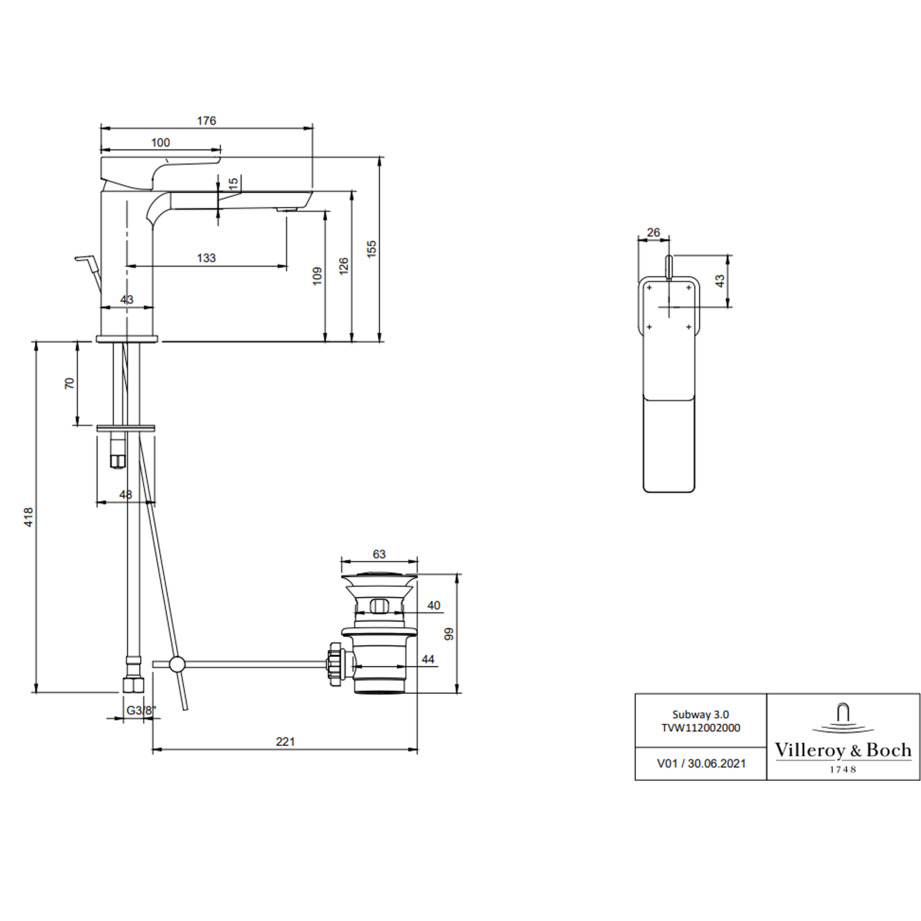 Caractéristiques du Subway 3.0 Mitigeur Monocommande de lavabo, Bec Long, Avec vidage Chrome (TVW11200200061)