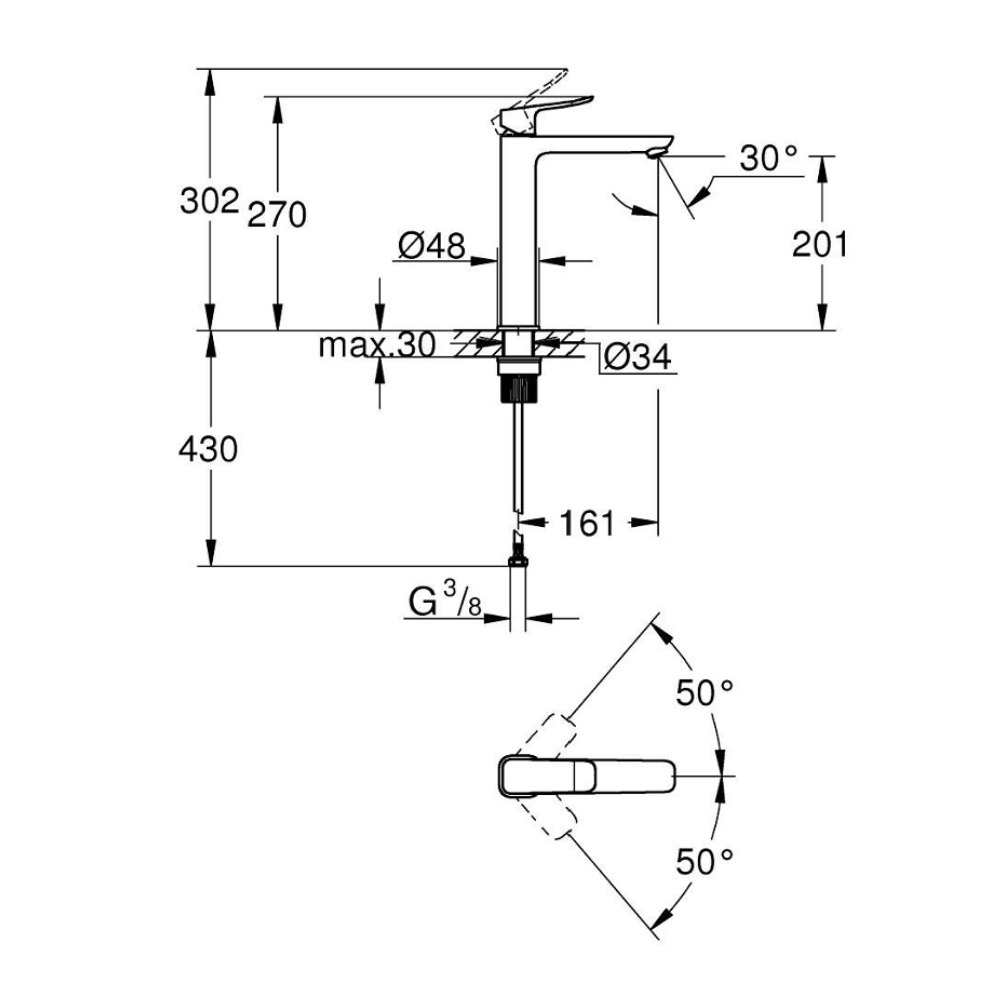 Caractéristiques du mitigeur lavabo monocommande XL à levier, avec cartouche en céramique, sans tirette ni vidage, Grohe Dice, noir mat (1018922430) :