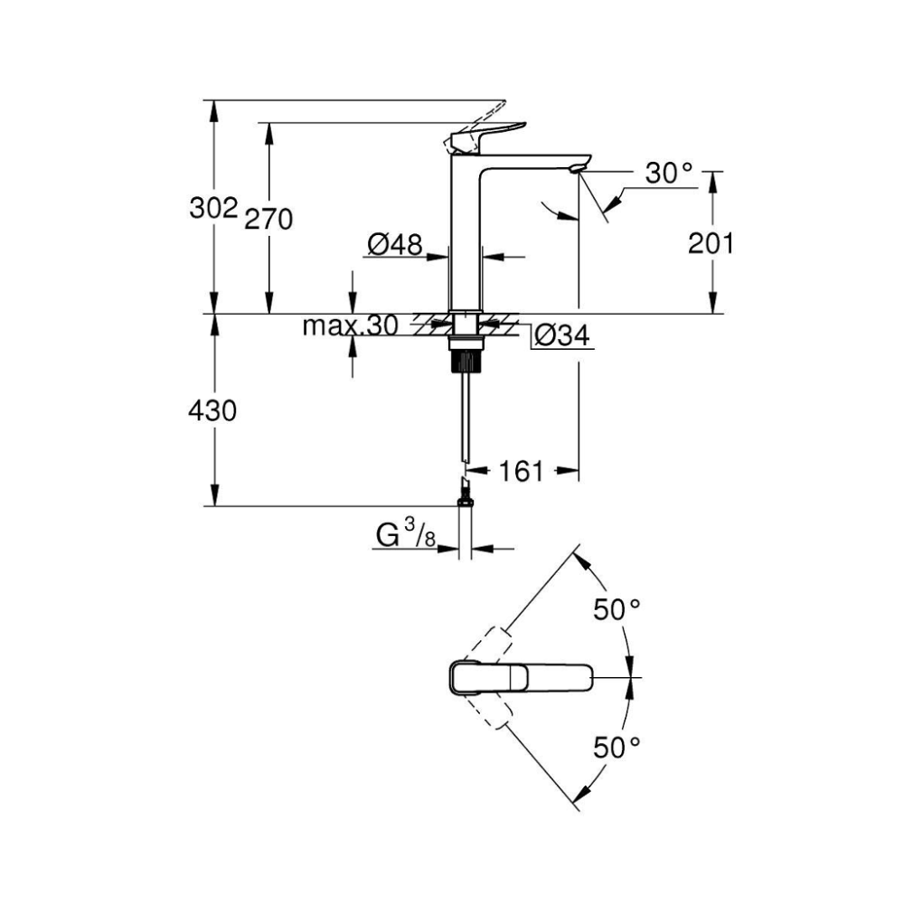 Caractéristiques du mitigeur monocommande de lavabo XL à levier, sans vidage, avec cartouche céramique, Grohe Dice, chrome brillant (1018920000) :