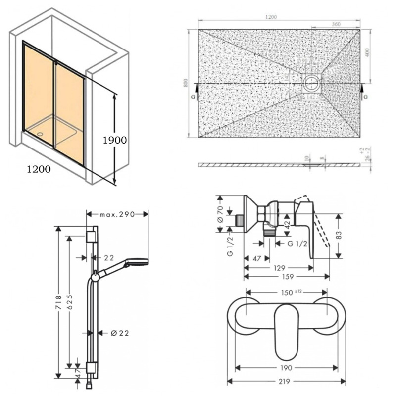 Caractéristiques du Pack douche Porte coulissante 120cm + Set de douche avec mitigeur Hansgrohe + Receveur Satalek 120x80cm, Noir (HuppeHansgrohe1-12080BL-5) :