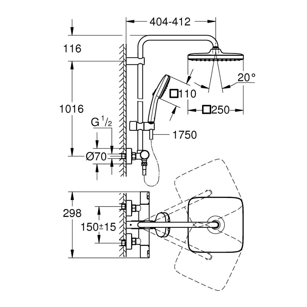 - Grohe Vitalio Comfort 250 Colonne de douche avec mitigeur thermostatique + Douche de tête + Douchette 2 jets, chrome (G26696001)