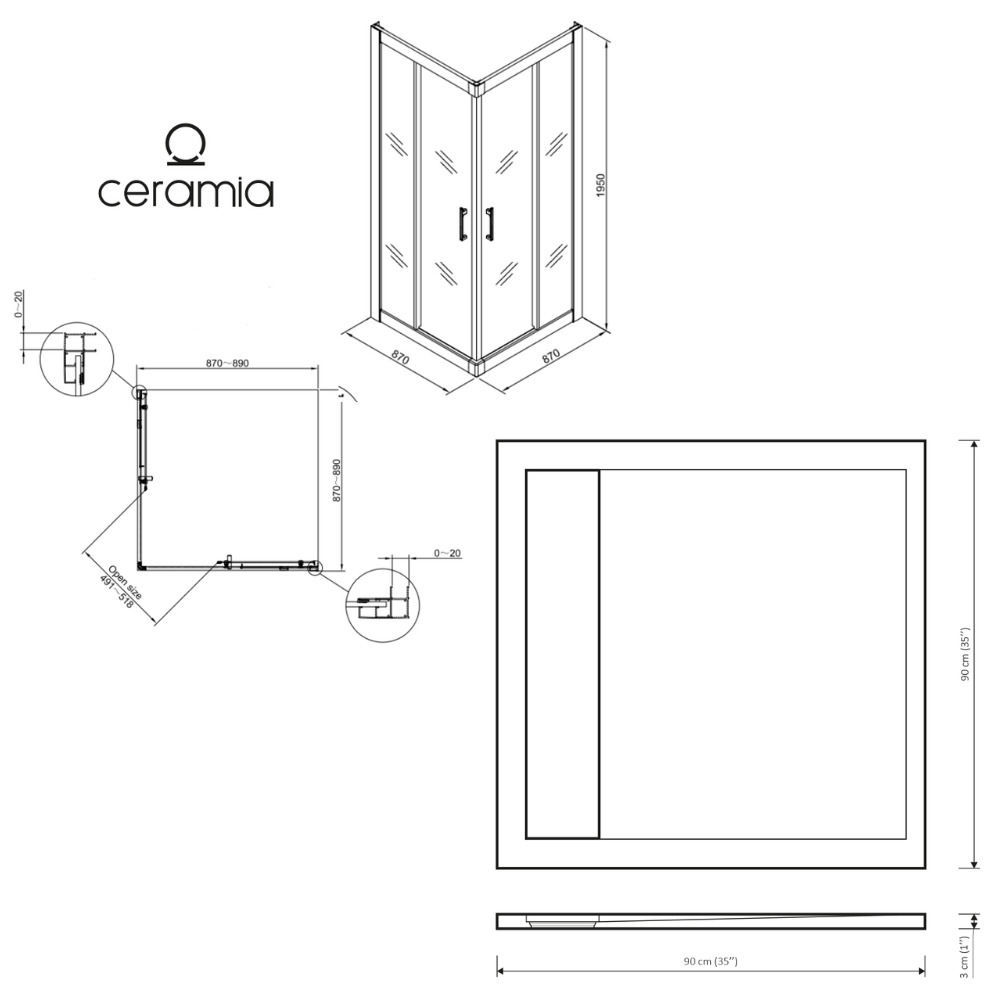 Ceramia Porte coulissante 90x90 + receveur blanc avec siphon (HCB-ALD15B-9090)