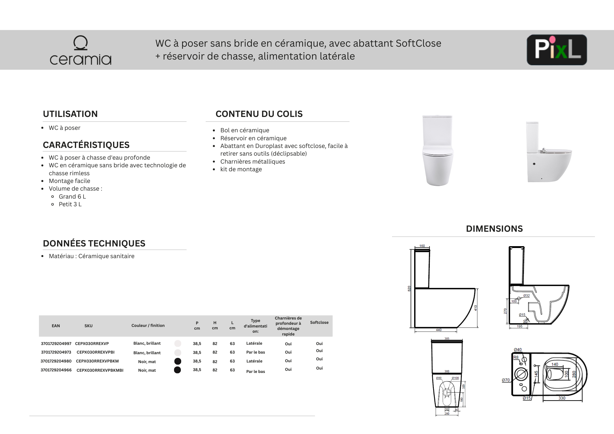 PixL ne se limite pas à ce modèle : c’est une collection complète de céramique sanitaire, avec WC à poser et WC suspendus, lavabos de différentes formes et couleurs, abattants et accessoires assortis. Avec CEPX030RREXVPBKM, vous obtenez non seulement un WC de haute qualité, mais aussi la possibilité de créer un intérieur de salle de bains harmonisé, fonctionnel et stylé.