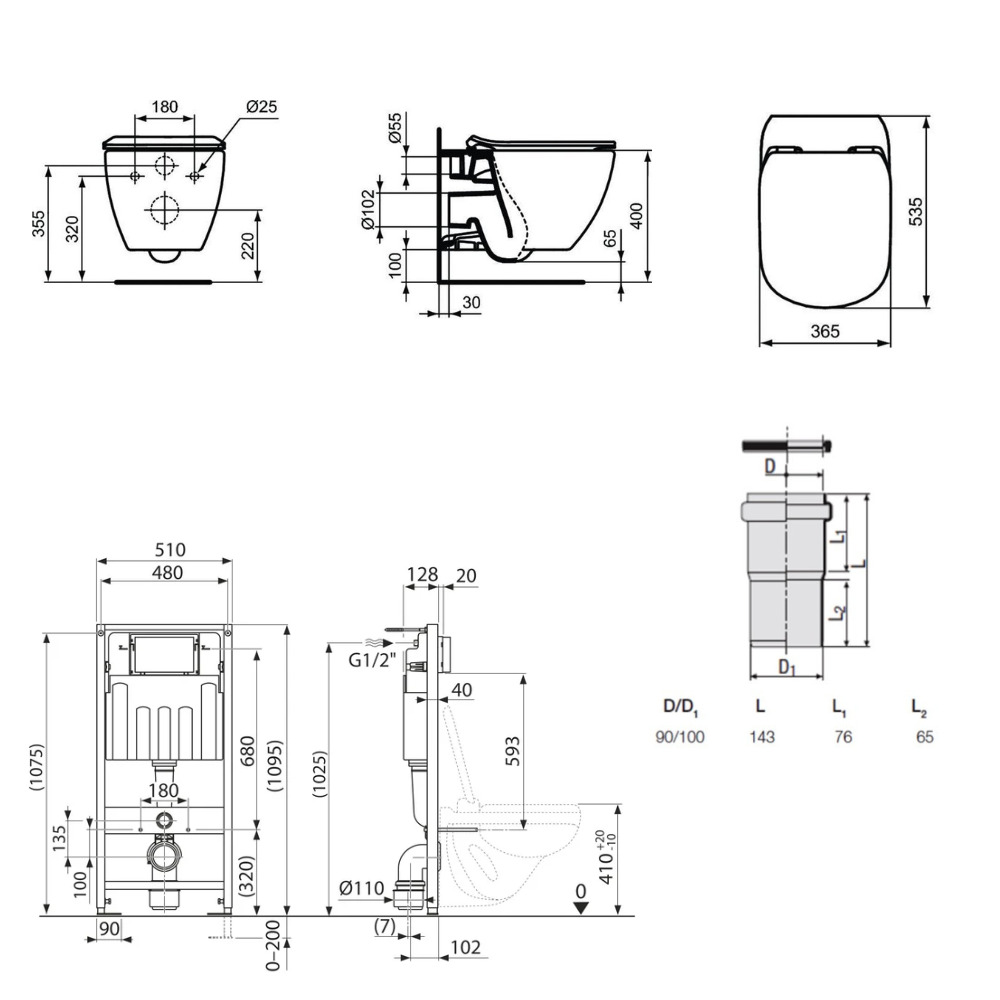 - Dans le cas d’une fixation à 320 mm du sol fini, la hauteur du siège sans abattant sera de 400mm et la distance entre le fond de la cuvette et le sol fini sera de 60 mm