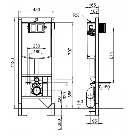 - Pour cloison sèche, pour montage en îlot, plage de réglage des pieds entre le sol brut et le niveau supérieur du sol terminé : de 0 à 200 mm, réglage en profondeur du rebord avant de l'élément entre 165 et 215 mm