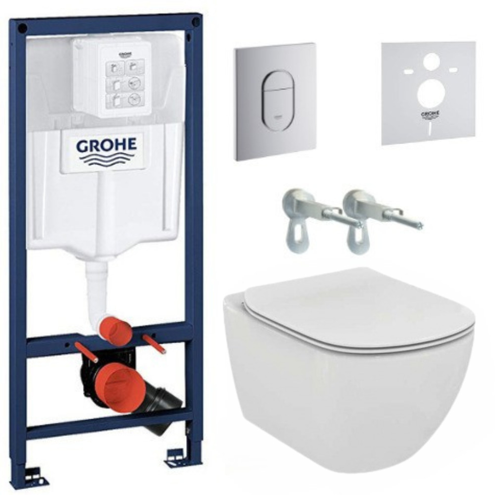 Grohe Pack WC Bâti-support + WC suspendu Ideal Standard Tesi Aquablade + Abattant slim avec frein de chute + Plaque Arena Chrome