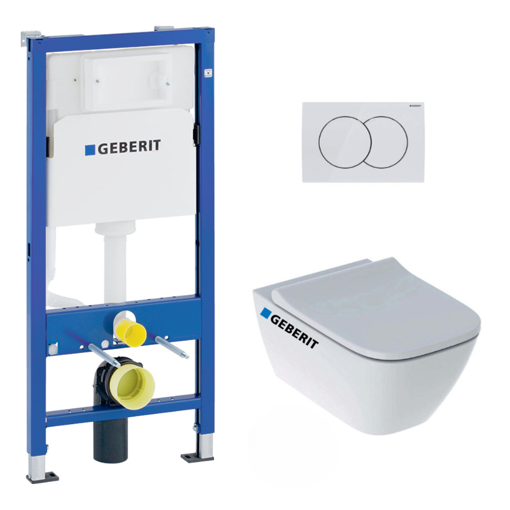 Pack WC Bati-support Geberit Duofix + WC sans bride Geberit Smyle + Abattant softclose + Plaque blanche (SmyleGeb1)