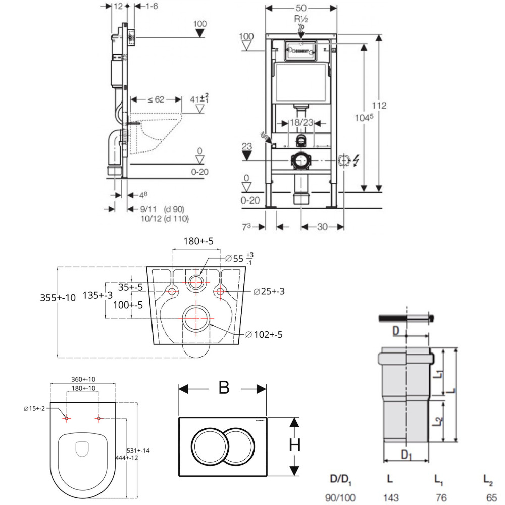 - 2 volumes de chasse d’eau avec les plaques de déclenchement Geberit Delta20, Delta 21 et Delta 50