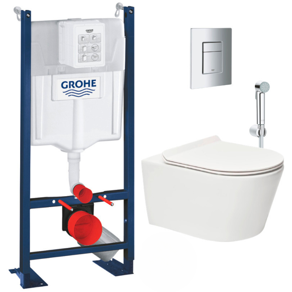 Grohe Pack WC Bâti autoportant + WC sans bride SAT Brevis + Abattant ultra-fin softclose + Douchette bidet + Plaque chrome mat