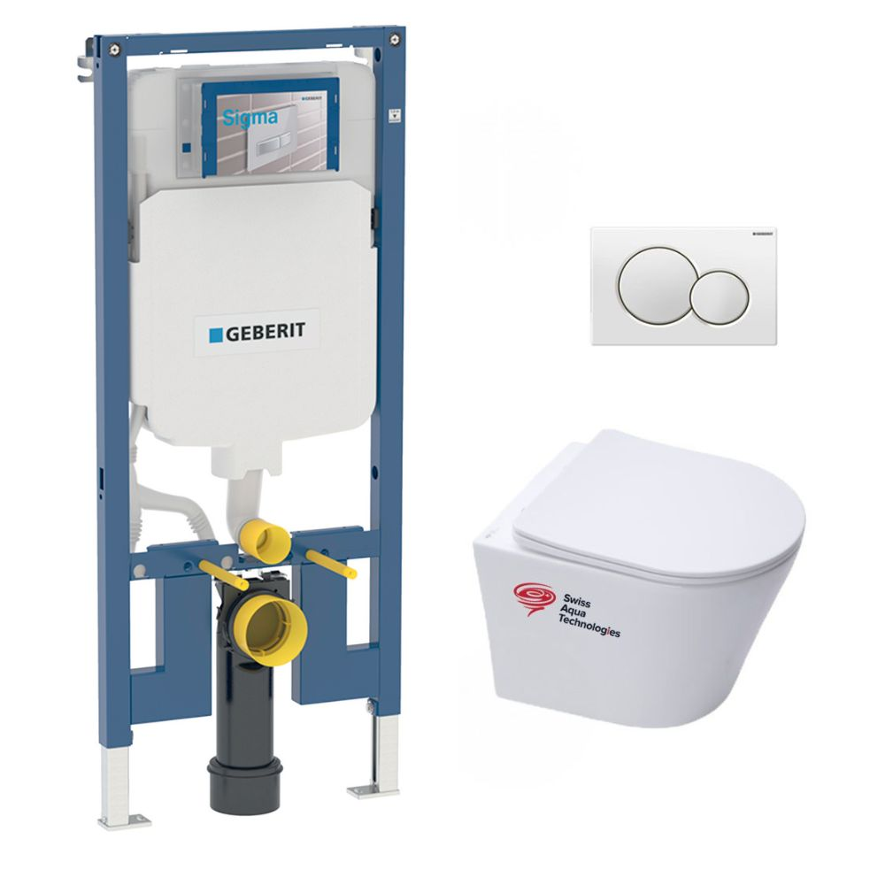Pack WC Bati-support Geberit extra-plat + Cuvette Swiss Aqua Technologies Infinitio sans bride + Plaque blanche
