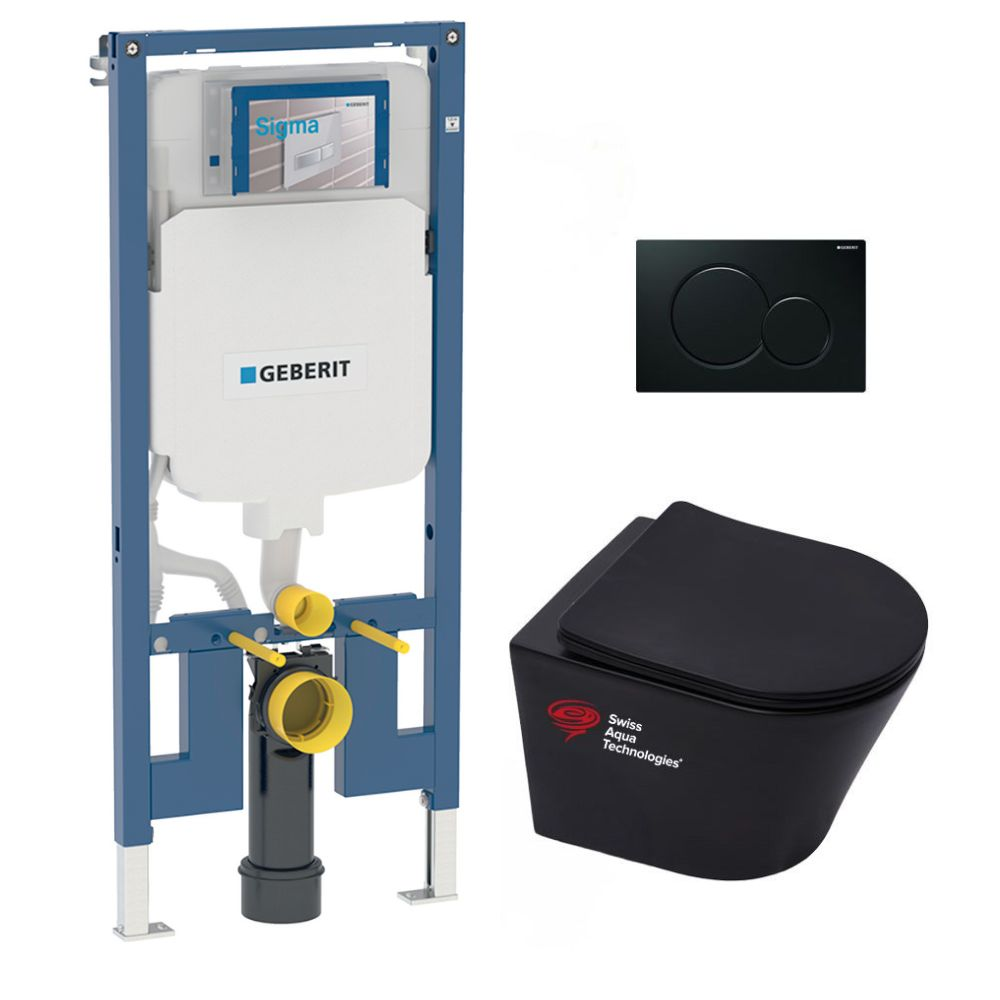 Caractéristiques du Pack WC bâti-support Geberit UP720 extra-plat + WC Swiss Aqua Technologies Infinitio noir mat sans bride + Abattant softclose + Plaque (SLIM-BlackInfinitio-A-SP) :