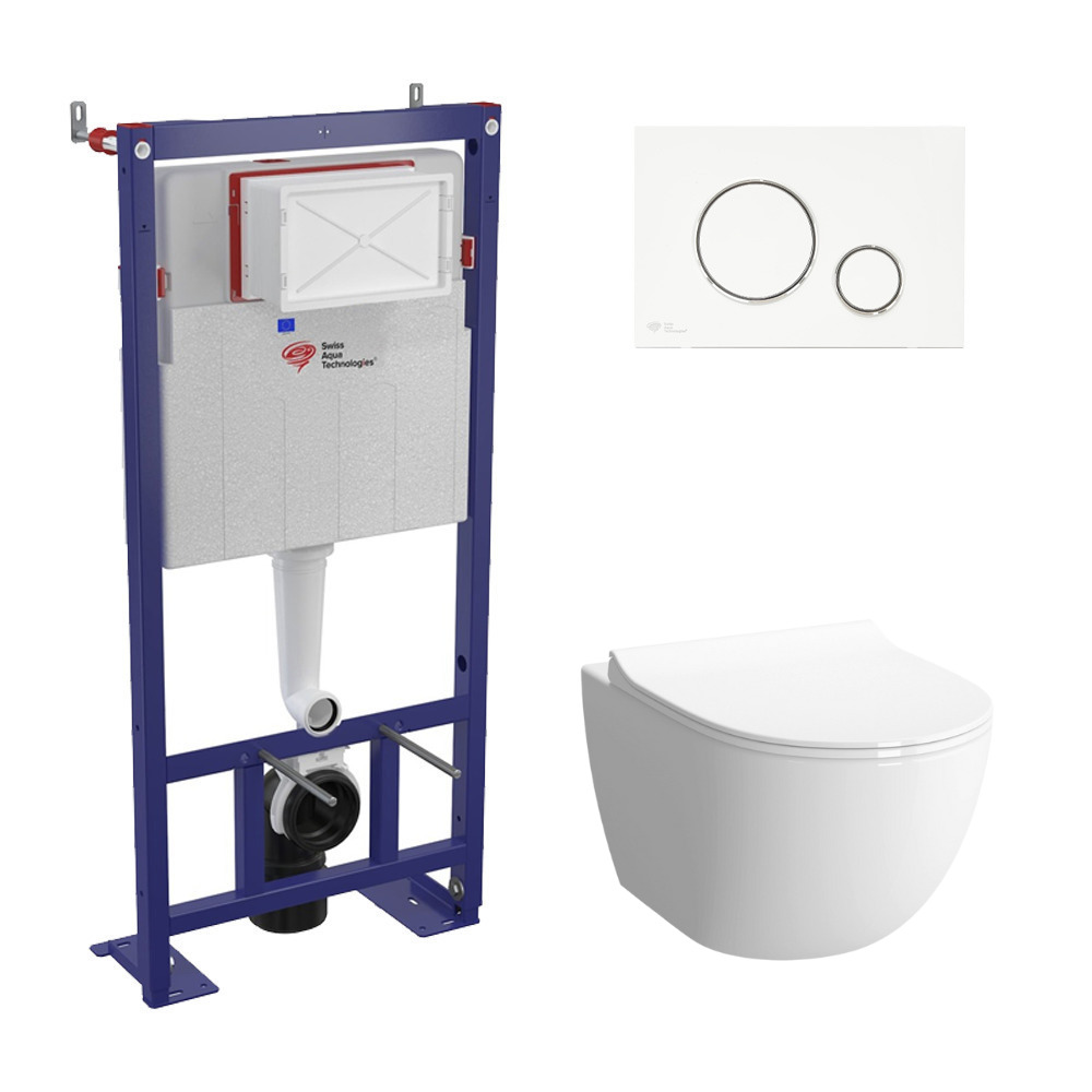 Swiss Aqua Technologies Pack WC bâti-autoportant + WC SAT infinitio sans bride fixations invisibles + Abattant softclose + Plaque blanche/chrome