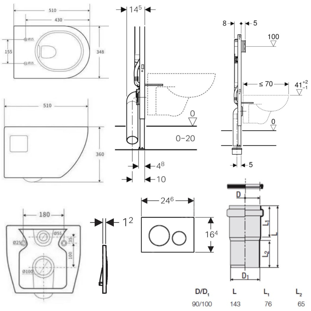 Caractéristiques du Pack WC Bâti-support Geberit Duofix extra-plat UP720 + WC sans bride Swiss Aqua Technologies + Abattant SoftClose + Plaque Blanche et Chrome (SLIM-Project-C) :