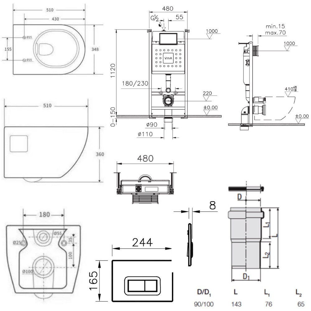 Vitra Pack WC Bâti-support V-Fix Core + WC sans bride SAT + Abattant SoftClose + Plaque, Blanc brillant (V-FixProject-1)