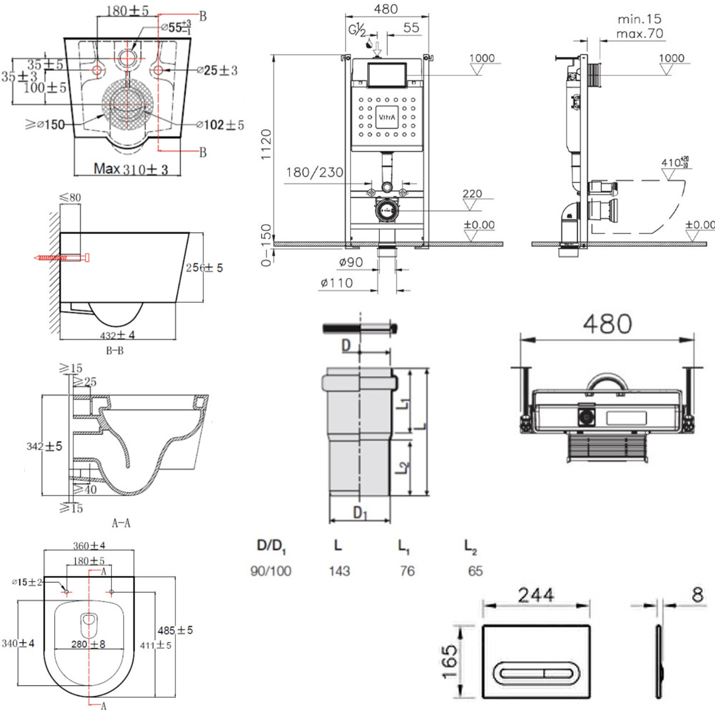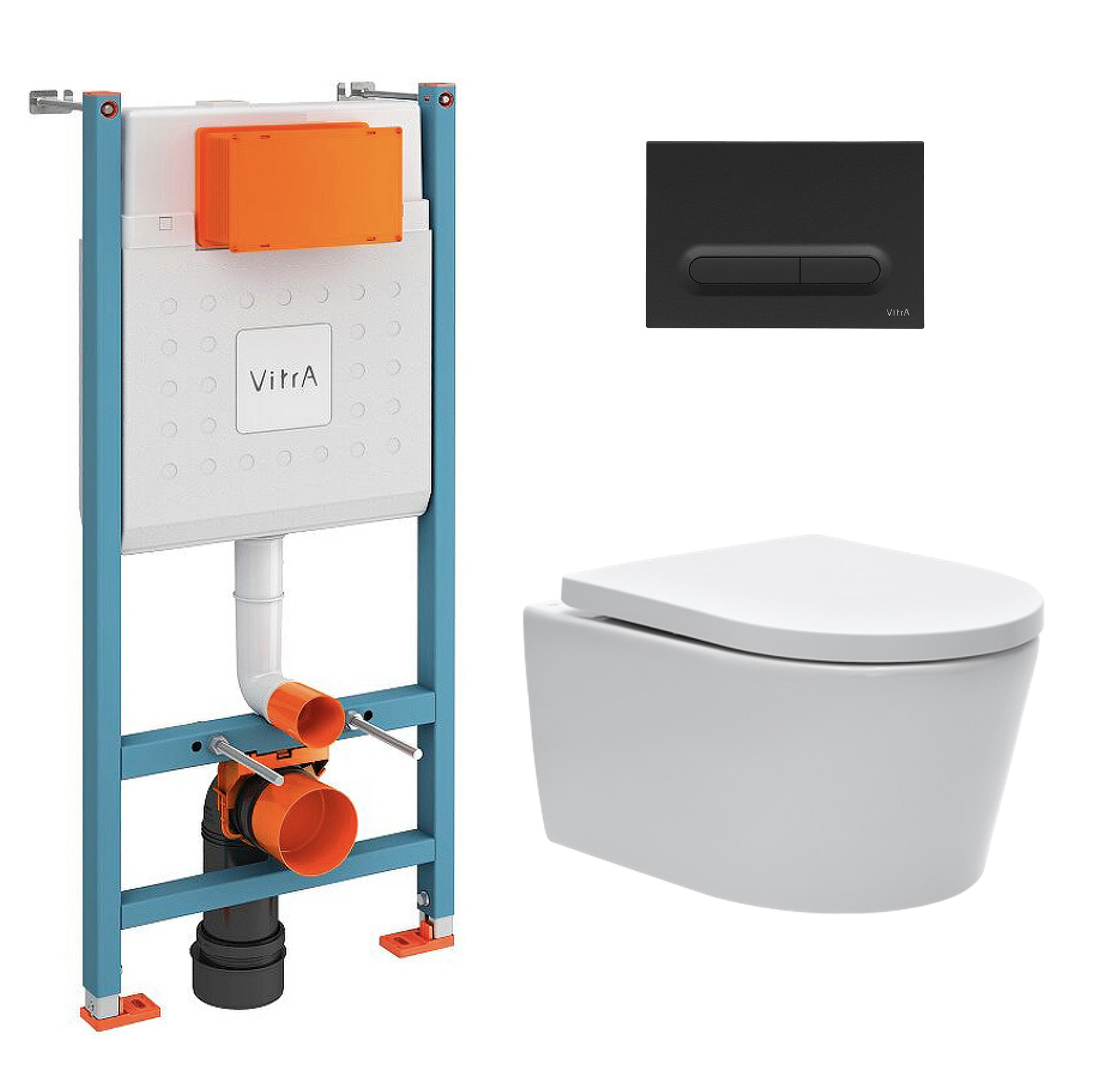 Vitra Pack WC Bâti-support V-Fix Core + WC SAT sans bride et fixations invisibles + Plaque Noir mat (V-FixSATrimless-6)