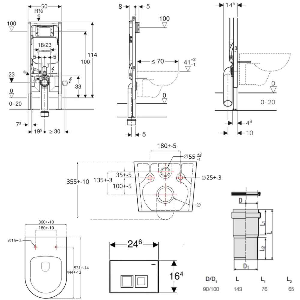 - Profondeur des plaques de pied adaptée à l'installation sur profilés en U UW 50 et rails pour système Geberit Duofix