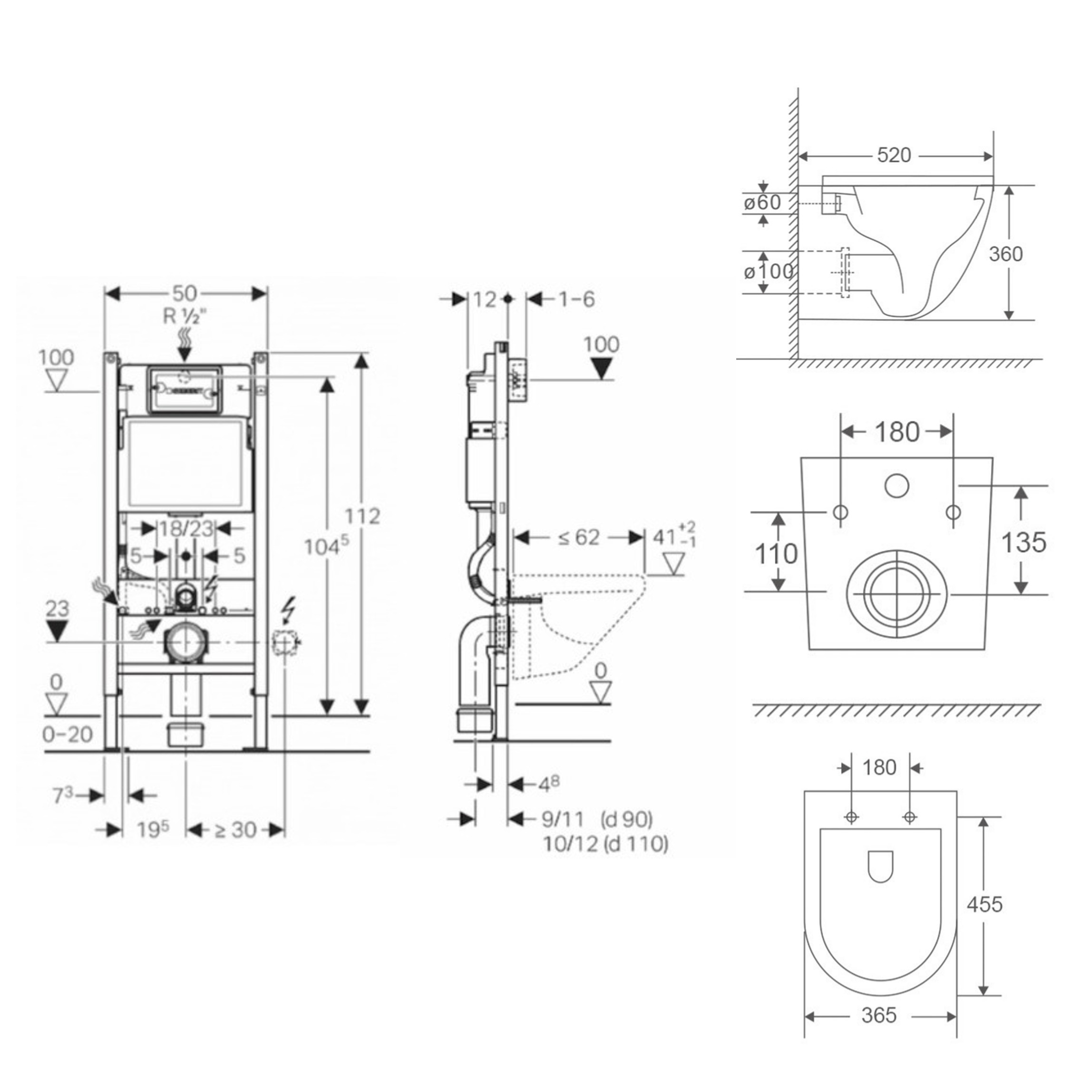 - Fournis avec pipe d'évacuation en PEHD (noire) diamètre 90 mm (Type Geberit / Grohe ) vers un réseau PVC (gris) en diamètre 100 mm (Standard Français)