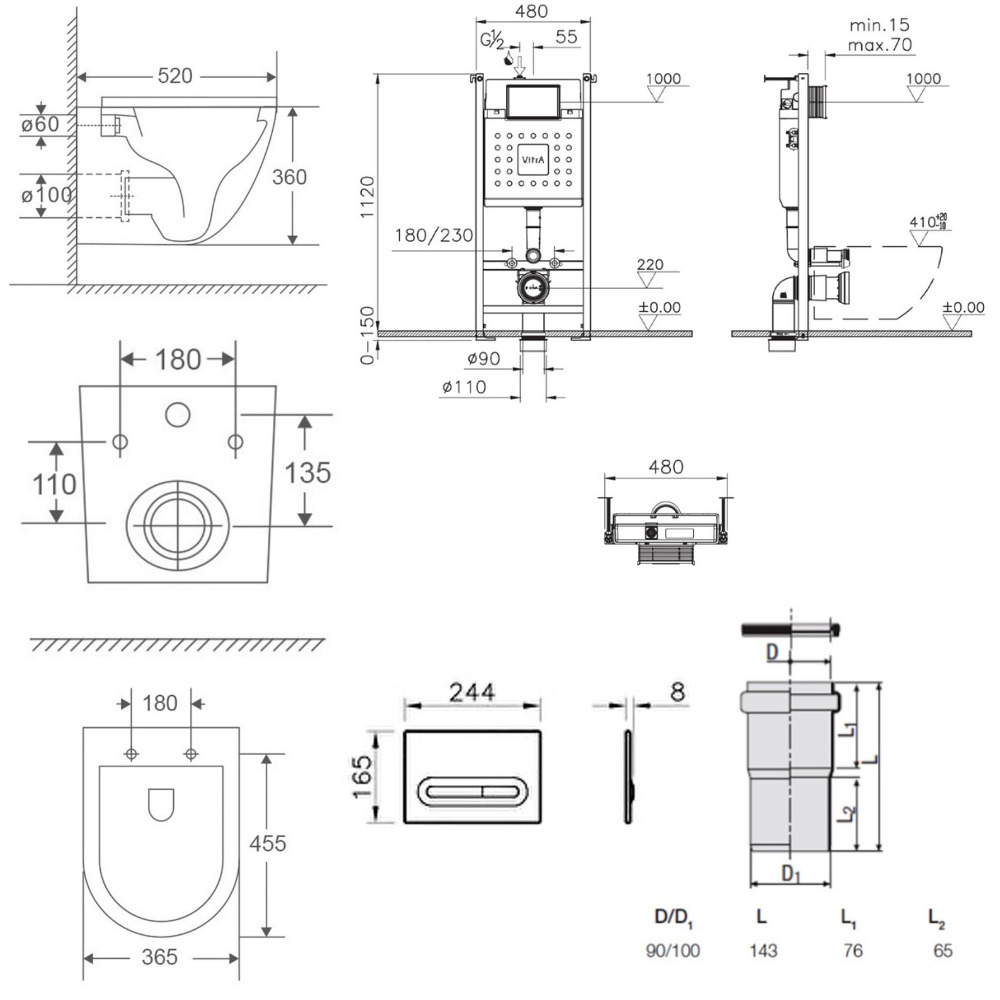 Caractéristiques du Vitra V-Fix Core bâti support pour WC, 1.12 M (732-5800-01) :