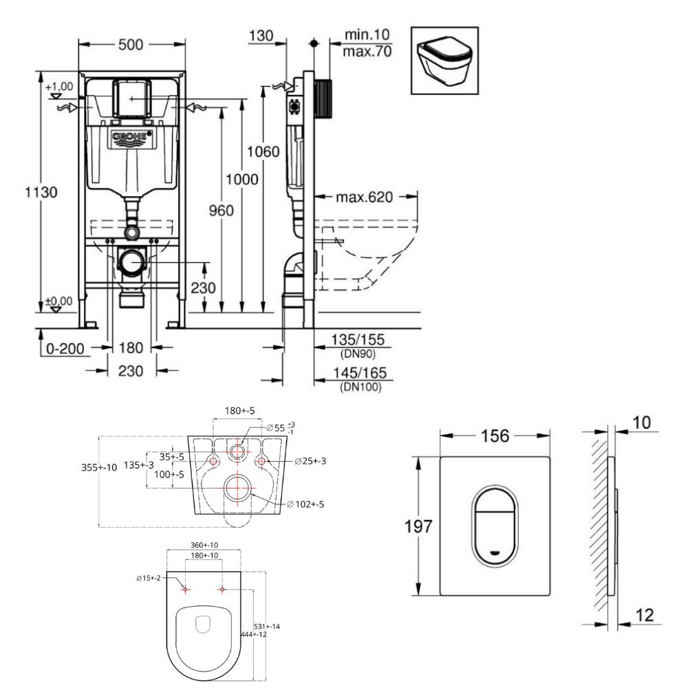 Grohe Pack Rapid sl+ plaque arena chrome+ Fixations murales + set d'isolation phonique + WC suspendu sans bride (ArenaBrevis)