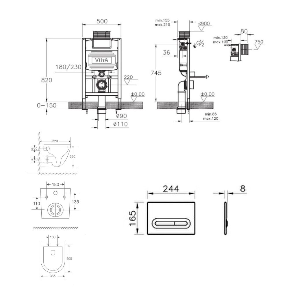Vitra Bâti support 82cm + WC suspendu + Abattant softclose + Plaque chrome mat (VUNI82FUSIONTQ-5)