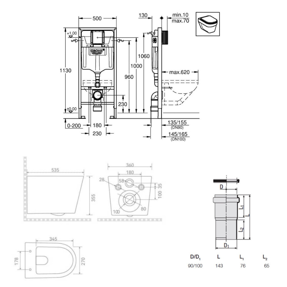 Caractéristiques du pack WC bâti-support Grohe Rapid SL + WC suspendu sans bride Ceramia + plaque noire mat (RSLCETORKF0) :
