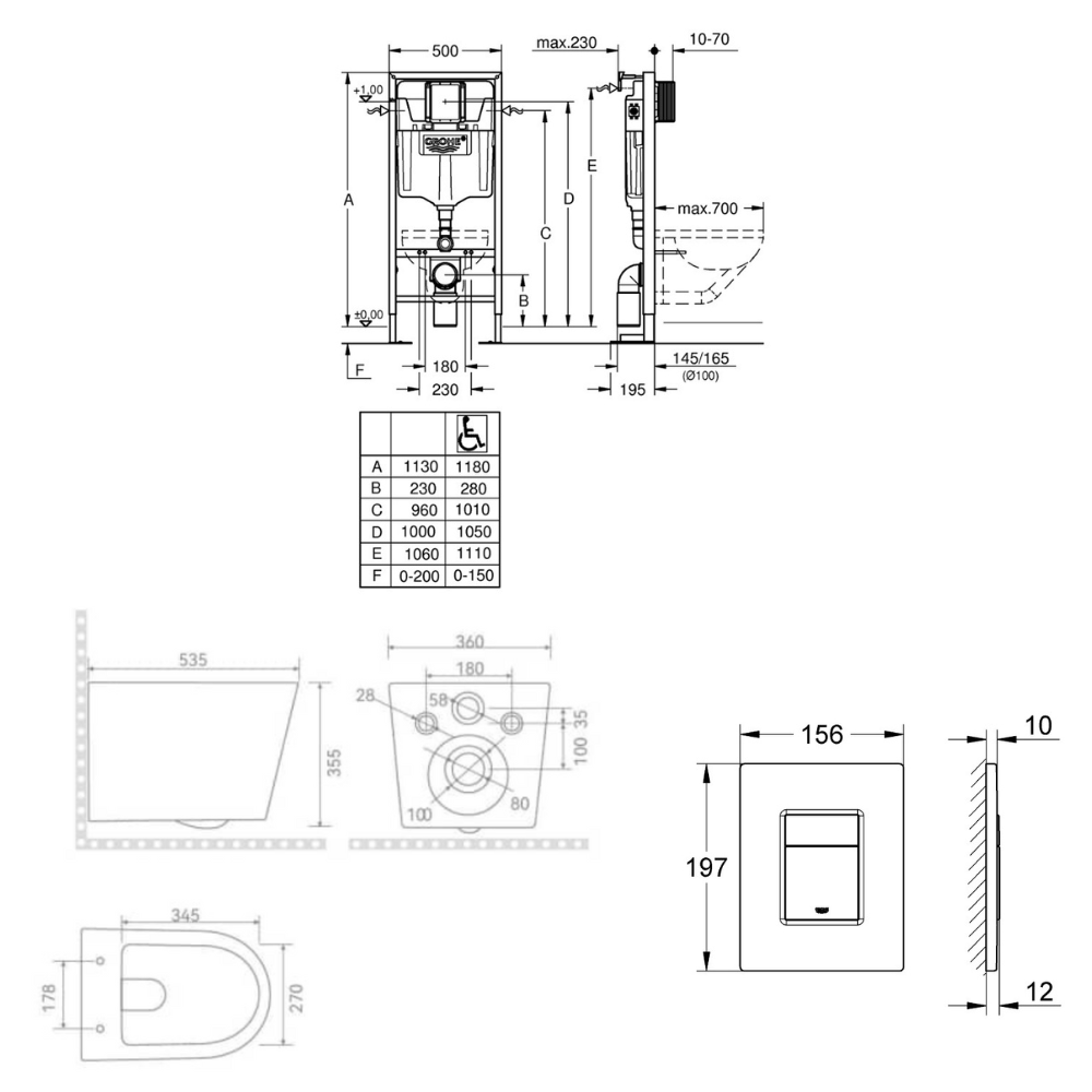 Caractéristiques du pack WC bâti-support autoportant Grohe Solido 1.13 M + WC sans bride Ceramia + abattant SoftClose + plaque chrome (AUTOPORTANT-CETOR1) :