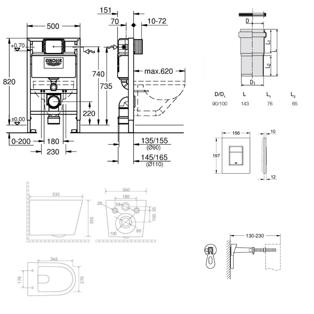 Caractéristiques du Pack WC bâti-support Grohe Rapid SL + WC suspendu sans bride Ceramia + abattant SoftClose + plaque chrome (RSL082CETOR1) :