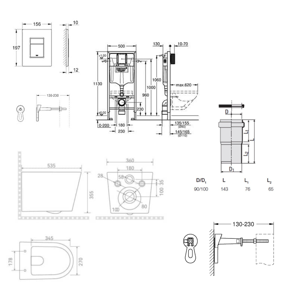 Caractéristiques du pack WC bâti-support Rapid SL + WC suspendu sans bride + abattant SoftClose + plaque chrome, Grohe, blanc (RAPIDSL-CETOR) :