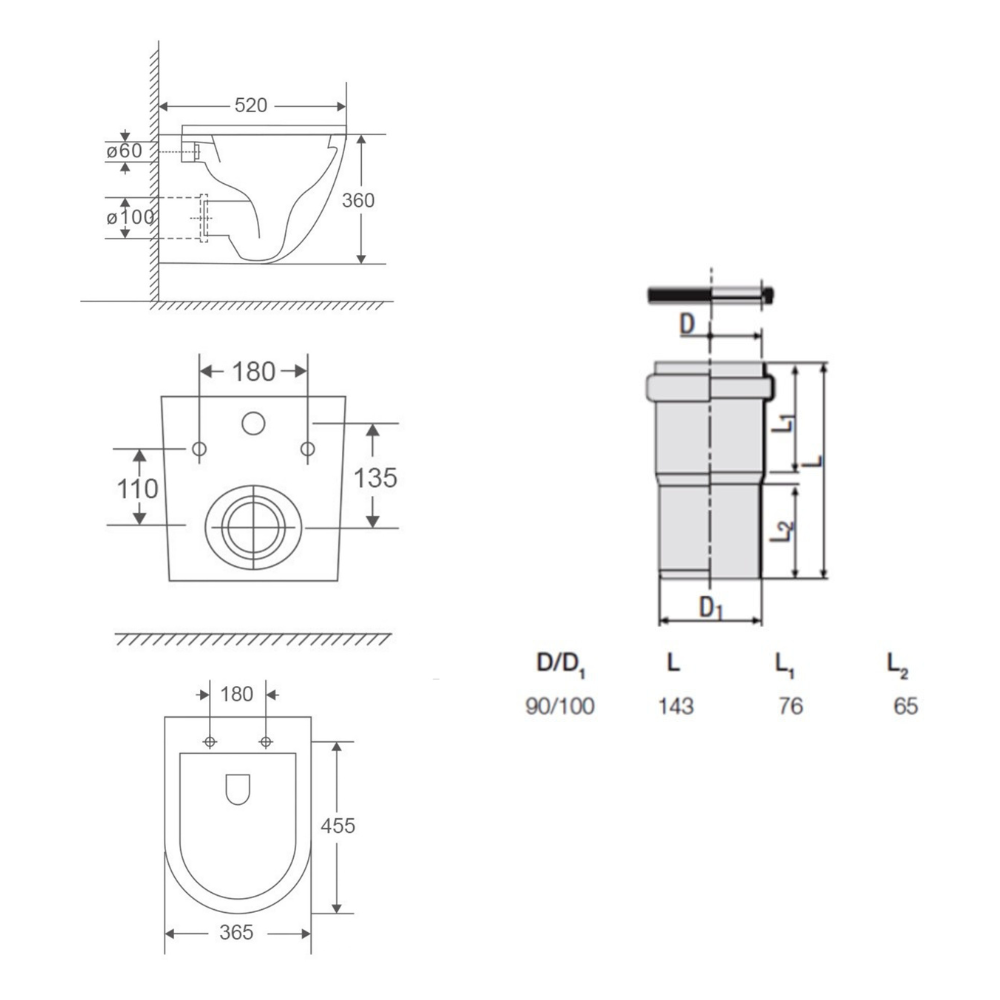 - Fournis avec pipe d'évacuation en PEHD (noire) diamètre 90 mm (Type Geberit / Grohe ) vers un réseau PVC (gris) en diamètre 100 mm (Standard Français)