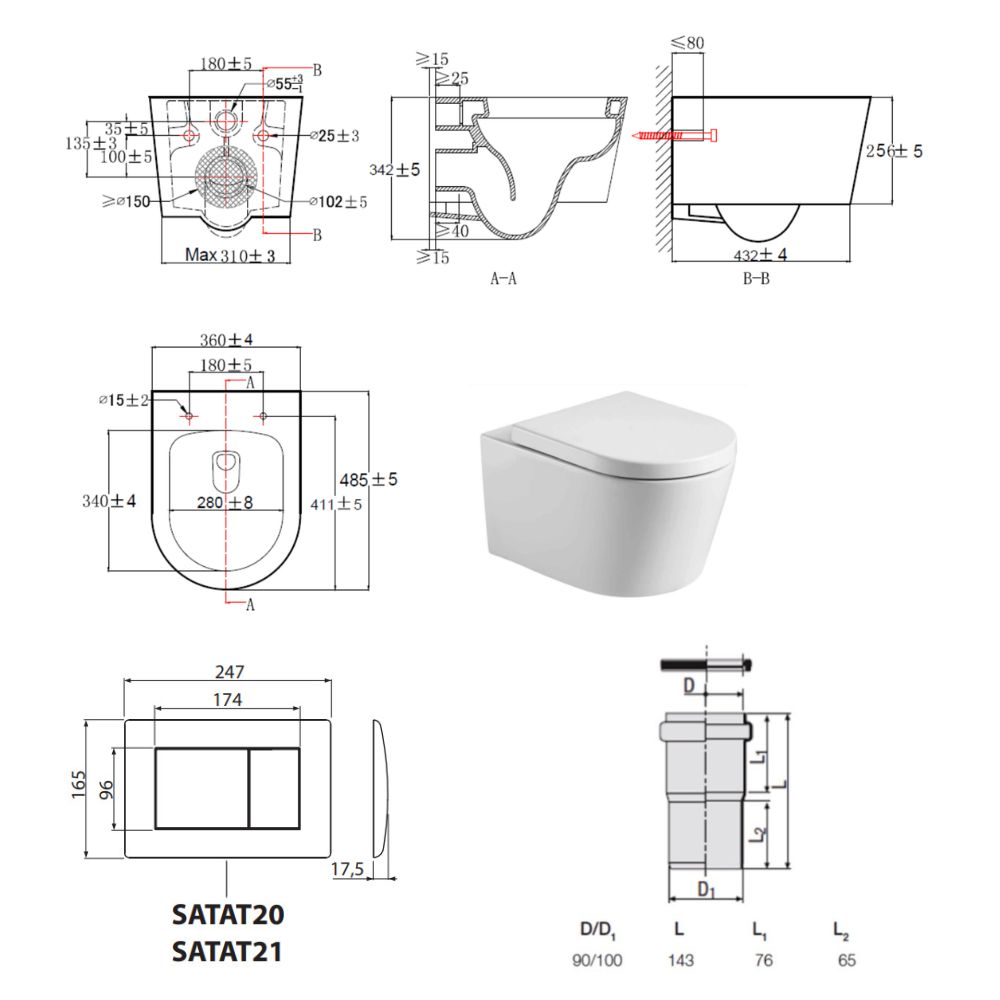 WC suspendu sans bride et fixations invisibles + abattant frein de chute (SATBRE010RREXP) :