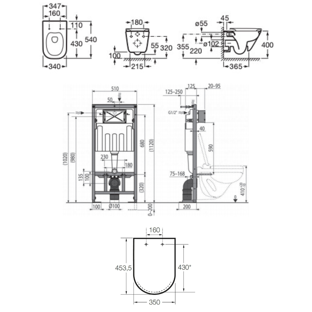 Caractéristiques du pack WC bâti-support autoportant + WC suspendu sans bride avec abattant SoftClose + plaque blanc/chrome brillant (STROGAWR04-U) :