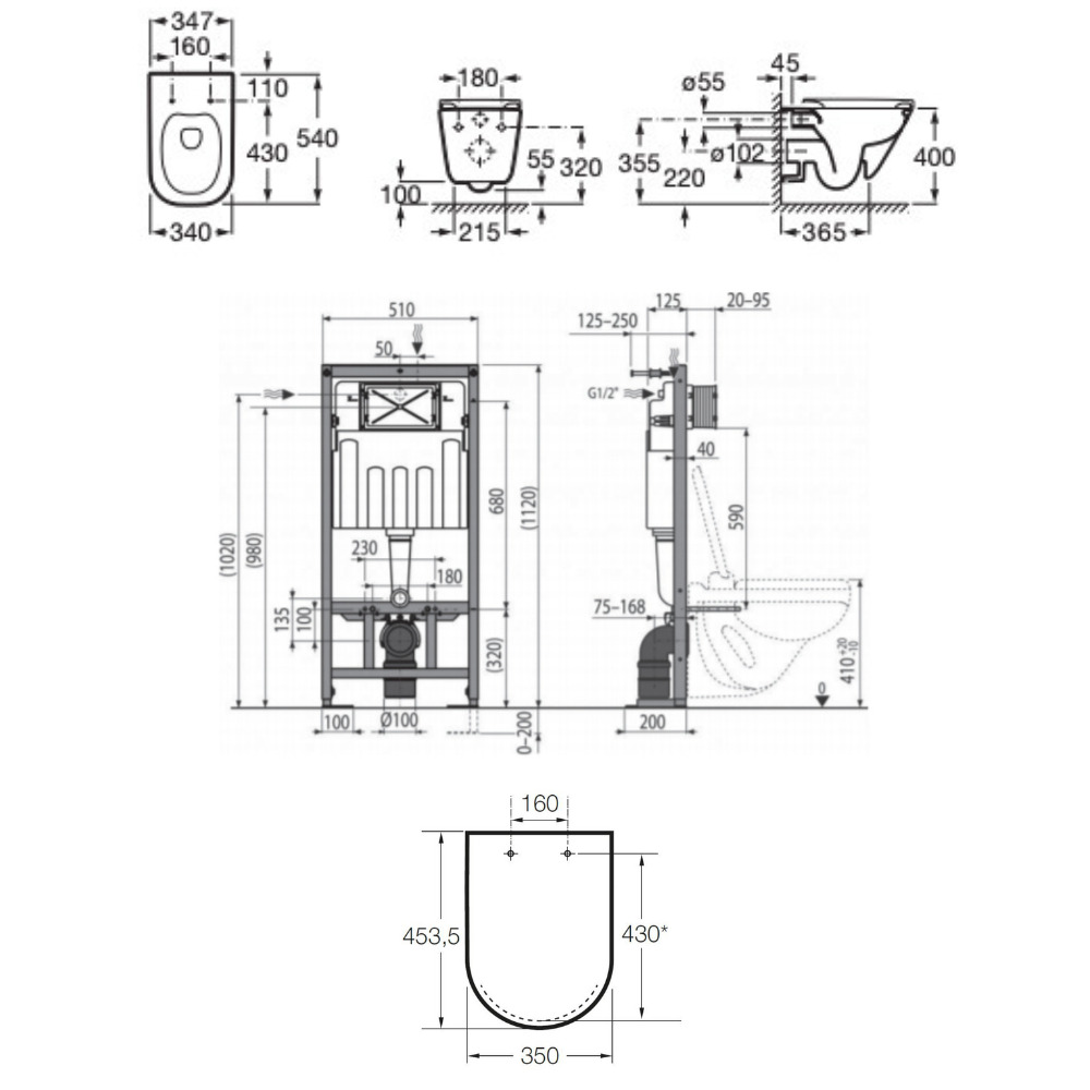 Caractéristiques du pack WC bâti-support autoportant + WC suspendu sans bride avec abattant SoftClose + plaque noir mat (STROGAWR07-U) :