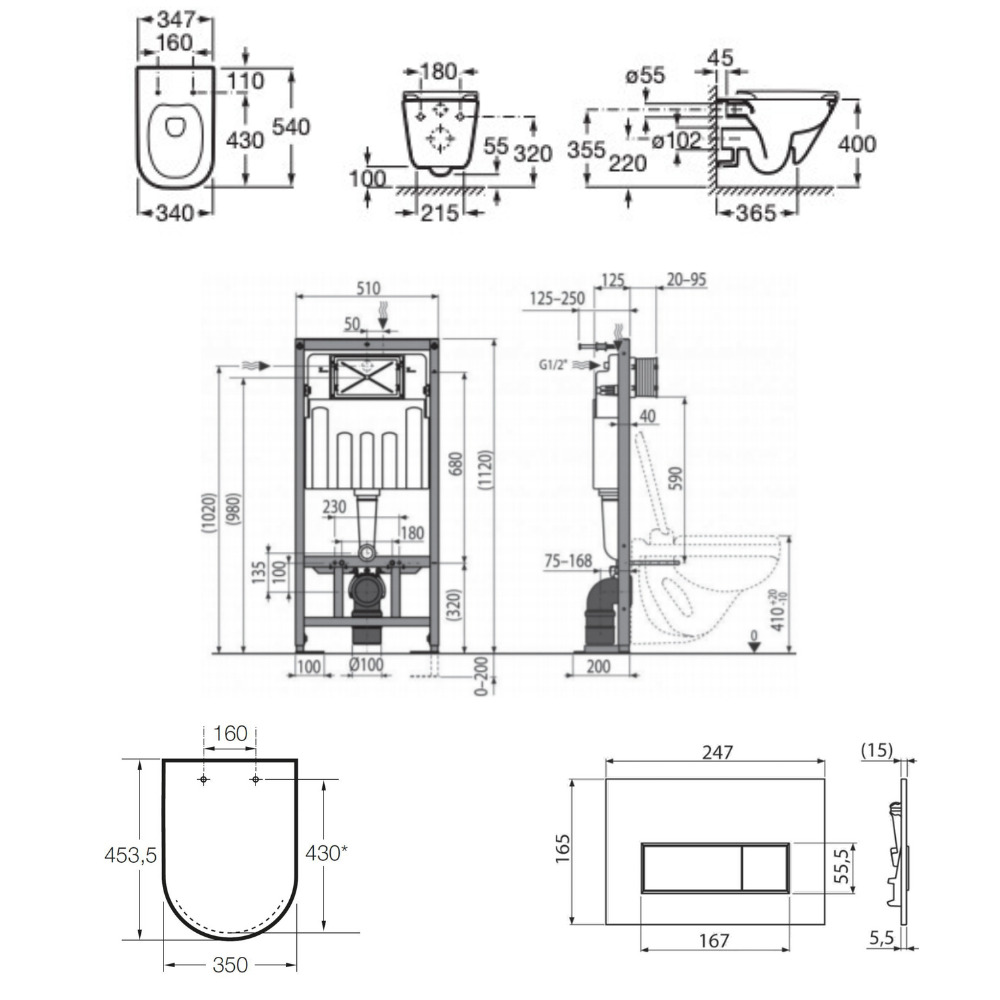 Caractéristiques du pack WC bâti-support autoportant + WC suspendu sans bride avec abattant SoftClose + plaque or mat (STROGAWR08-U) :