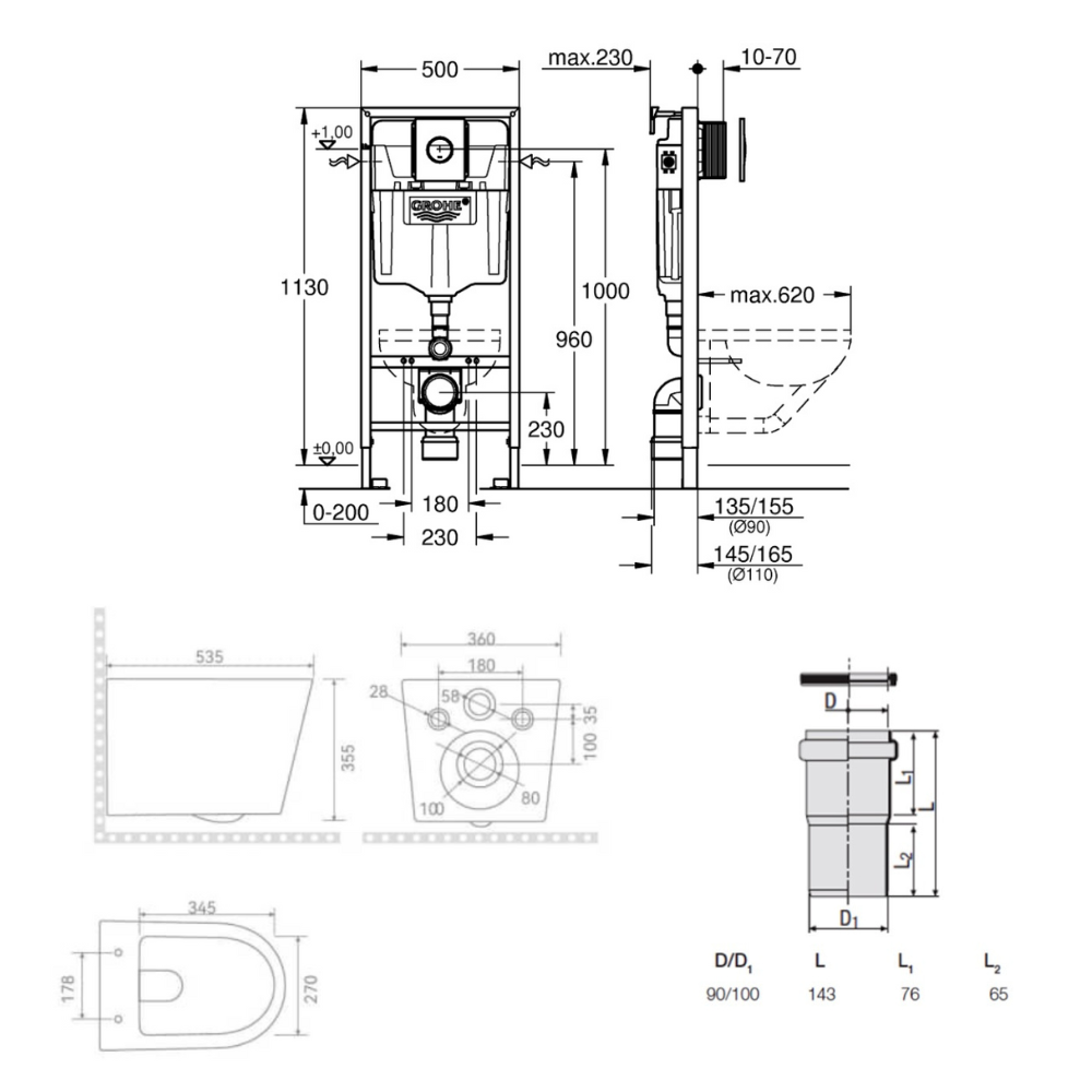 - Grohe Solido Kit WC suspendu 4-en-1, bâti-support encastré 1,13 m, chasse double, système Fresh + plaque chrome (G39978000)