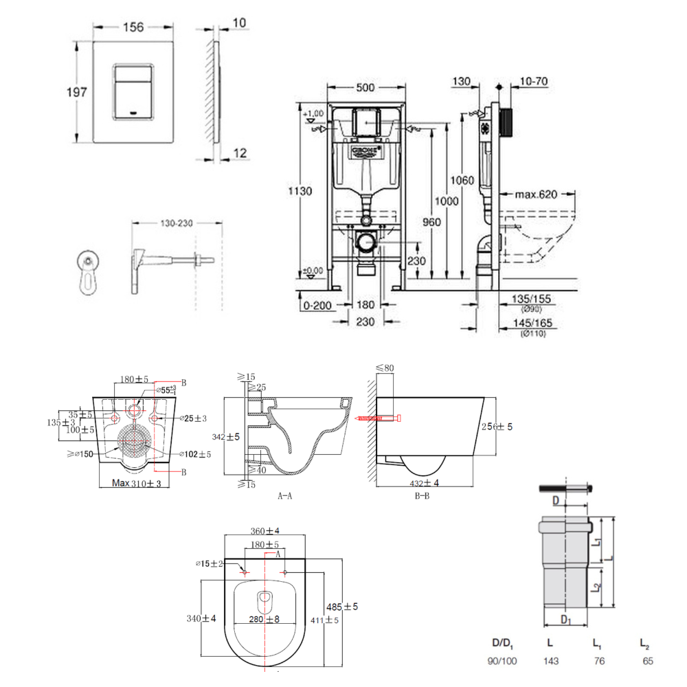 Caractéristiques du pack WC bâti-support Grohe Rapid SL + WC suspendu sans bride avec abattant SoftClose Swiss Aqua Technologies + plaque chrome (GRRSTBRWR01MAN-FR) :