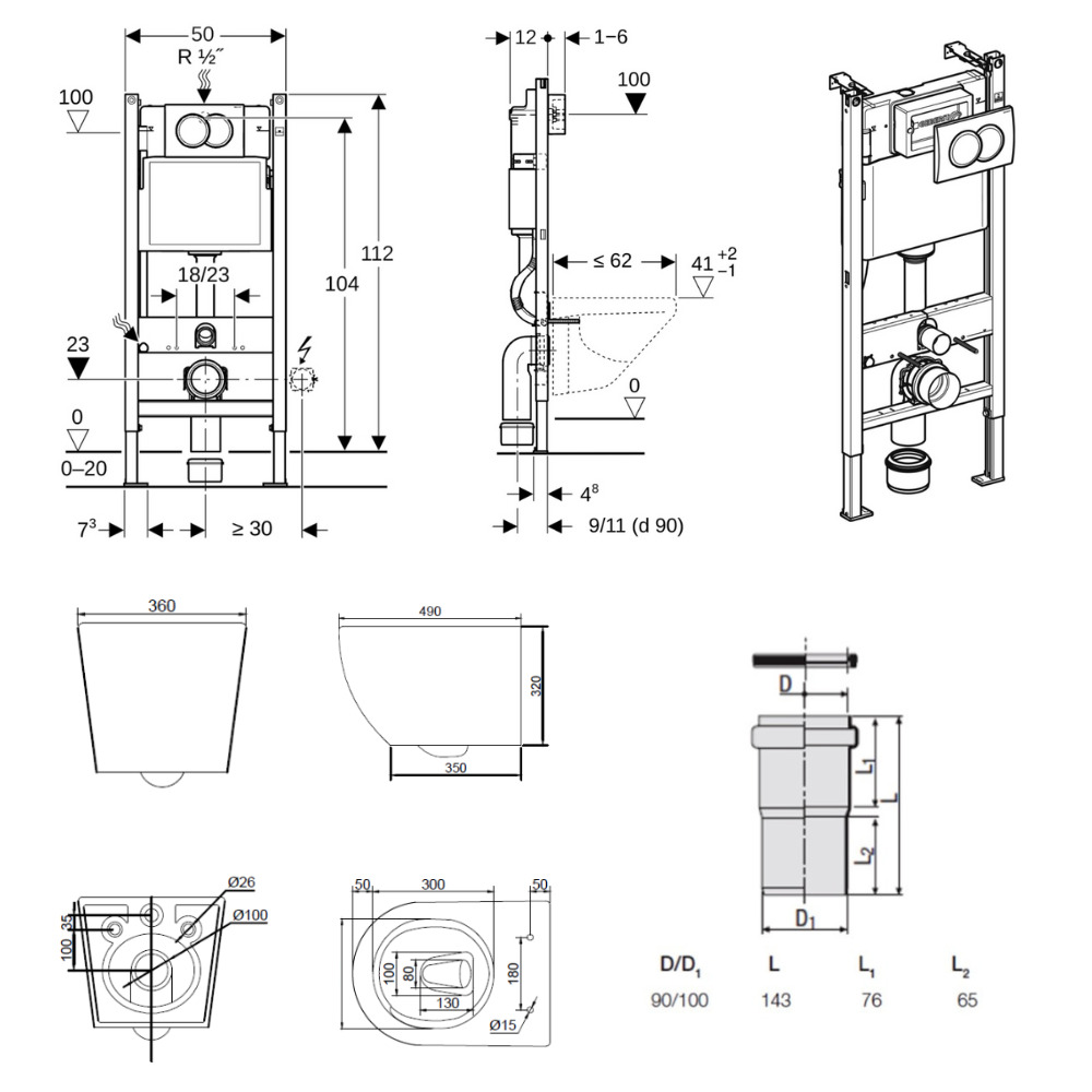 - Geberit Geberit Delta Pack bâti-support Duofix 112cm + Plaque de commande Delta01, Blanche + Fixations murales (111.154.11.3)