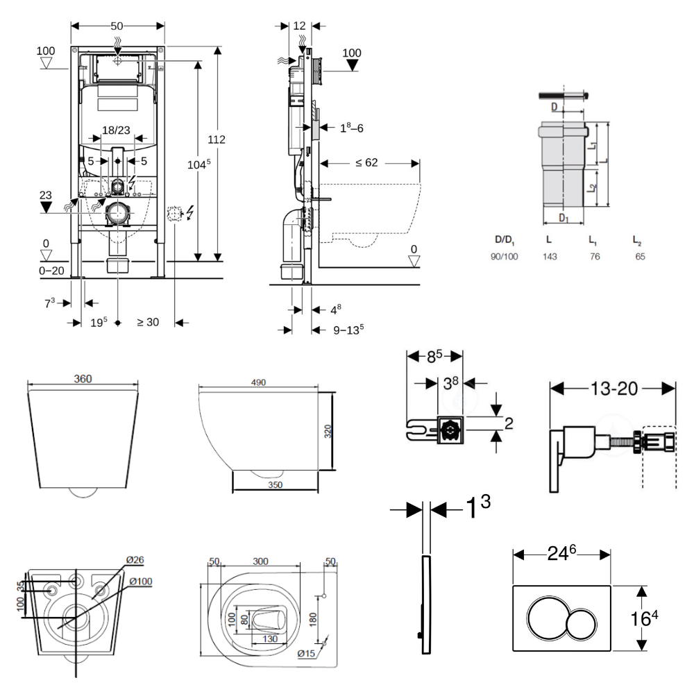 - Fixation pour coude d'évacuation sans outillage et avec isolation acoustique, réglable en profondeur sur 8 positions, plage de réglage 45 mm
