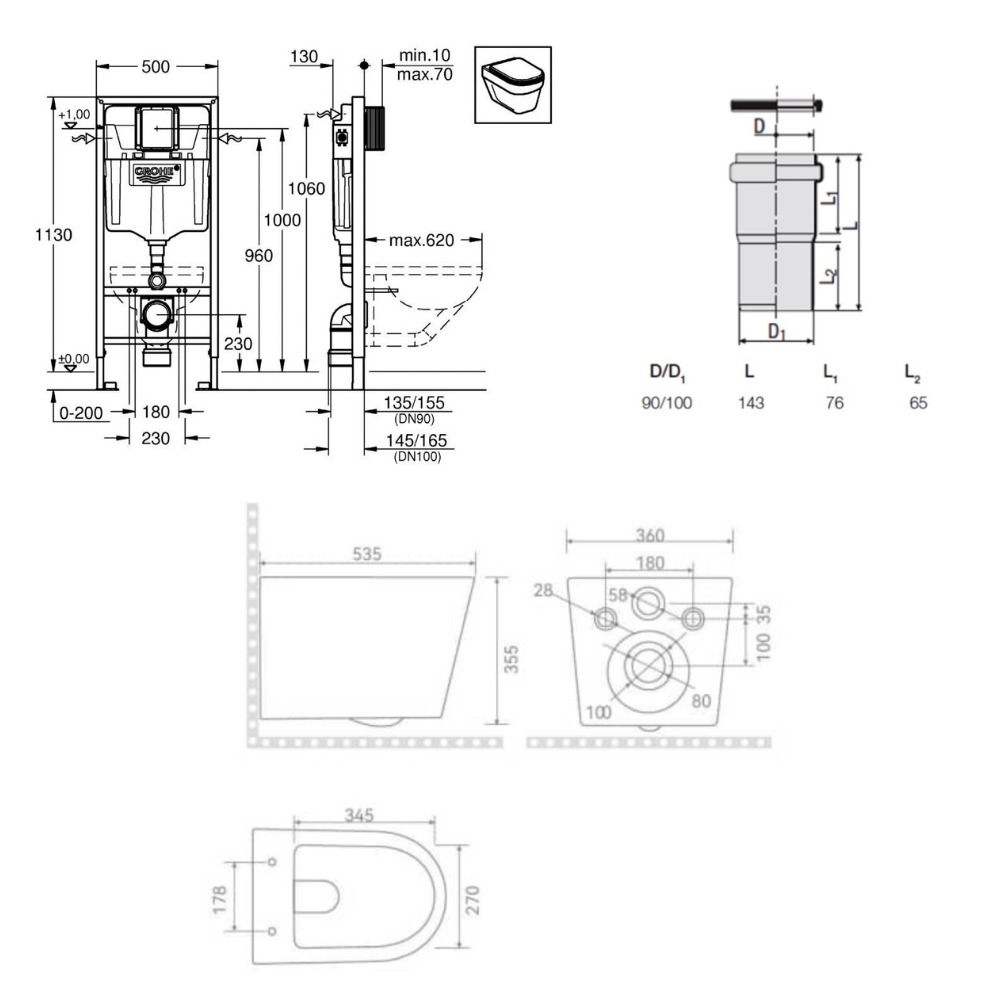 Caractéristiques du pack WC bâti-support Grohe Rapid SL + WC sans bride Ceramia avec abattant SoftClose + plaque noir mat (GRRCE14BMT01FR-FS) :