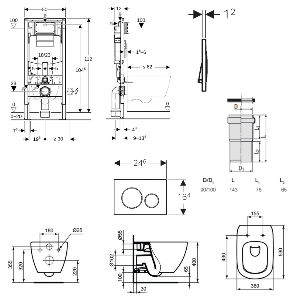 Caractéristiques du pack WC bâti-support Geberit Duofix UP320 + WC suspendu sans bride Ideal Standard avec abattant SoftClose + plaque (GEDTEBMA01-FR) :
