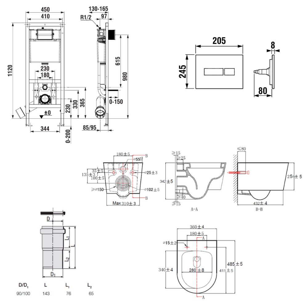 Bâti-support encastrable pour WC suspendu, installation sur cloison légère, hauteur 112 cm, chasse 2/4-6 L (A8900200Z0) :