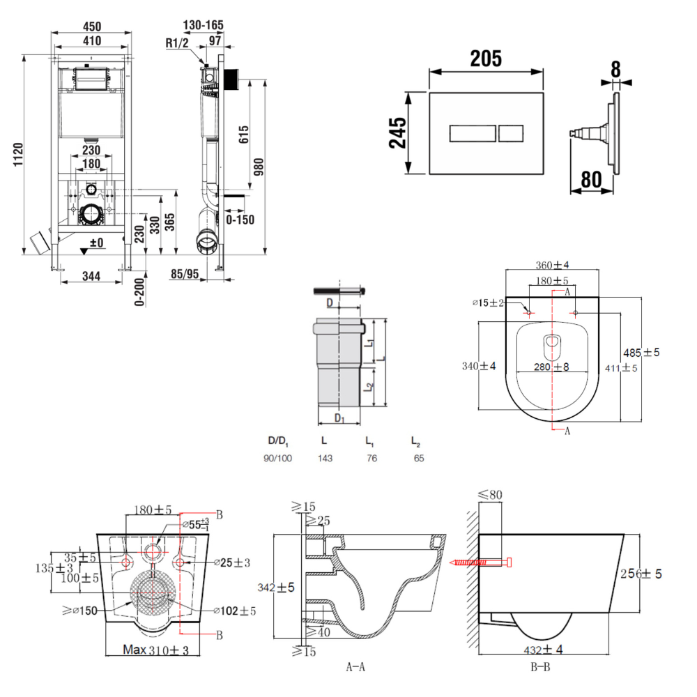 Bâti-support encastrable pour WC suspendu, installation sur cloison légère, hauteur 112 cm, chasse 2/4-6 L (A8900200Z0) :