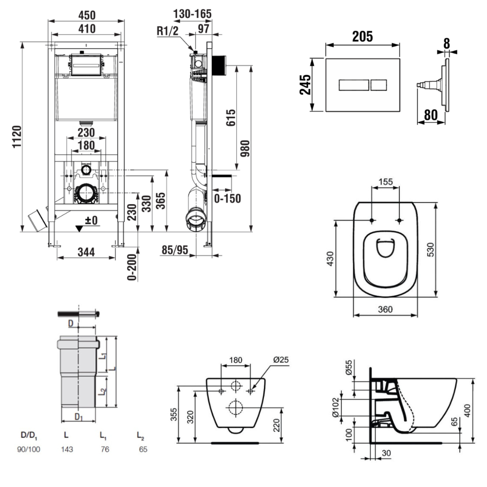Bâti-support encastrable pour WC suspendu, installation sur cloison légère, hauteur 112 cm, chasse 2/4-6 L (A8900200Z0) :