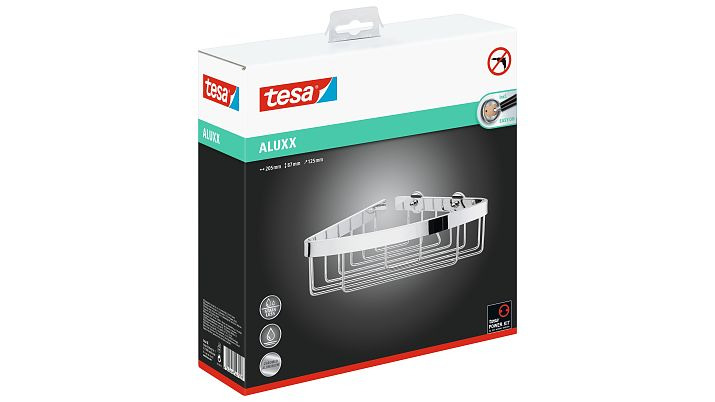 En aluminium avec finition chromée brillante, le panier d'angle tesa® Aluxx apportera une touche unique à votre salle de bain. Cet accessoire est livré avec de la colle dont le temps de séchage est de 12 heures et qui permet de fixer l'accessoire où vous le souhaitez. Aucun danger pour vos murs et carrelages. Le panier peut être retiré à tout moment sans laisser de traces. Le panier peut également être repositionné ailleurs en un instant.